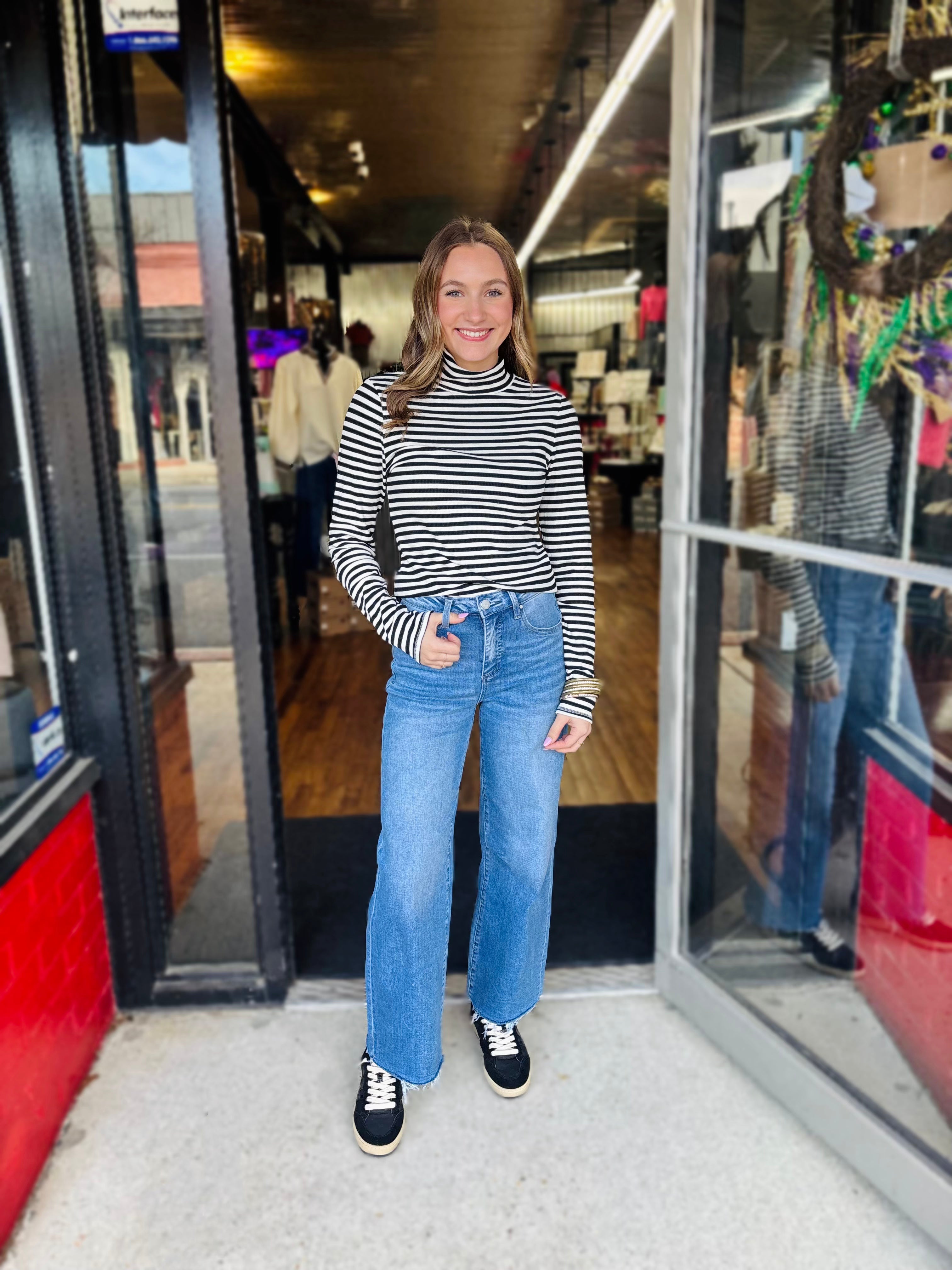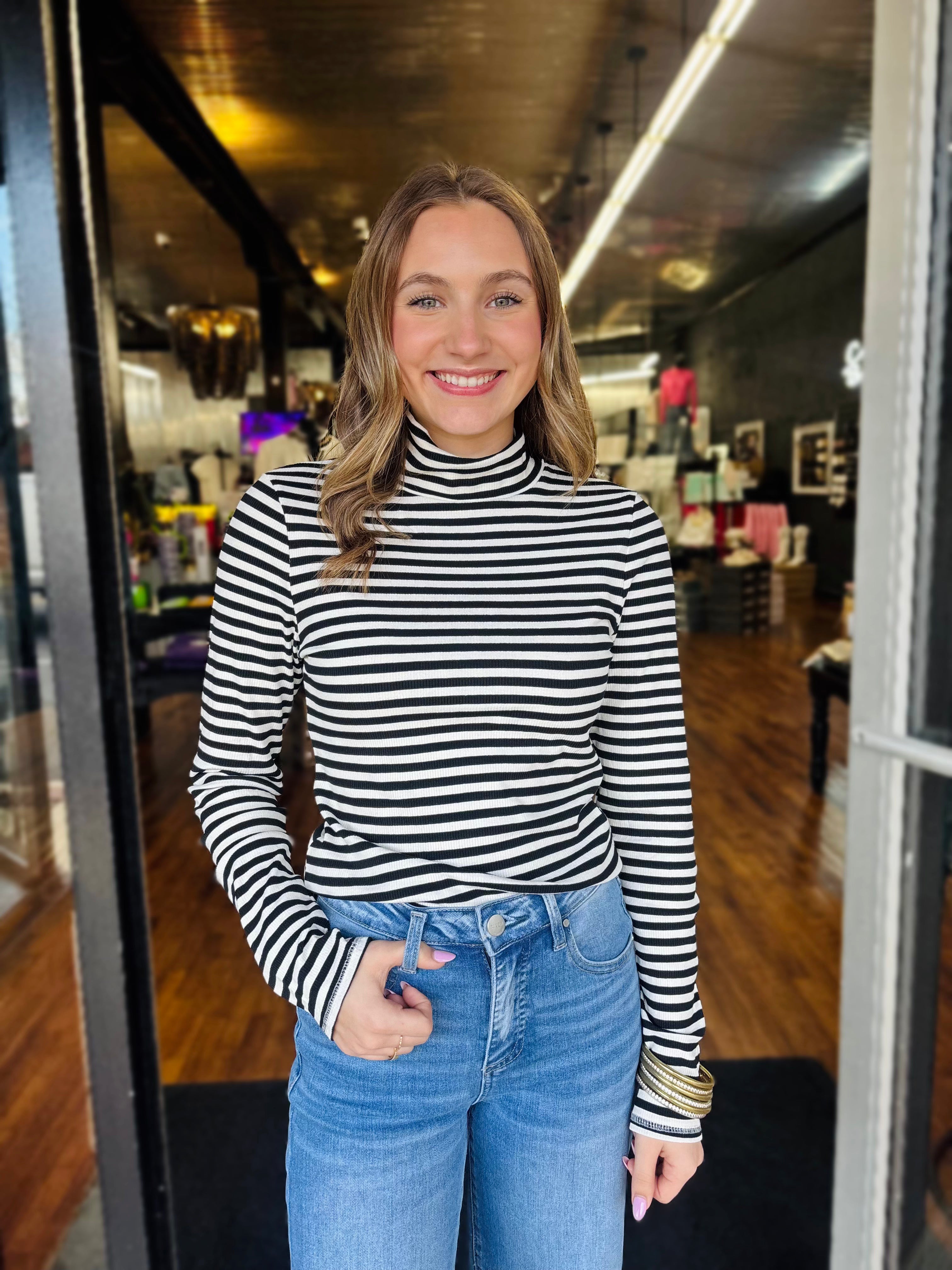 Elevate your style with this striped turtleneck top featuring long sleeves. Crafted with classic stripes, it's perfect for layering or pairing with jeans for a chic, versatile look. Ideal for casual outings or elegant dinners, this lightweight piece is easy to style year-round.