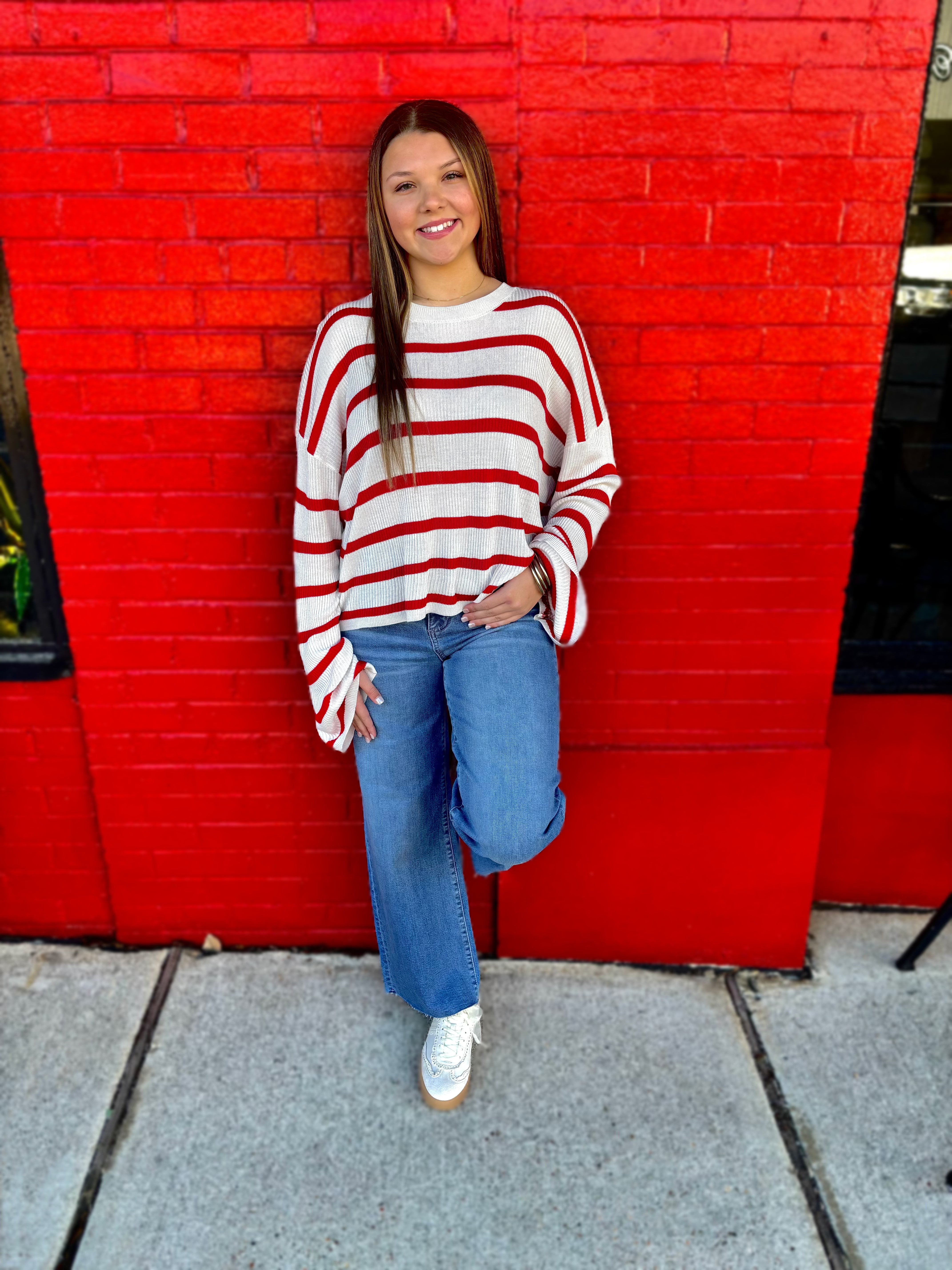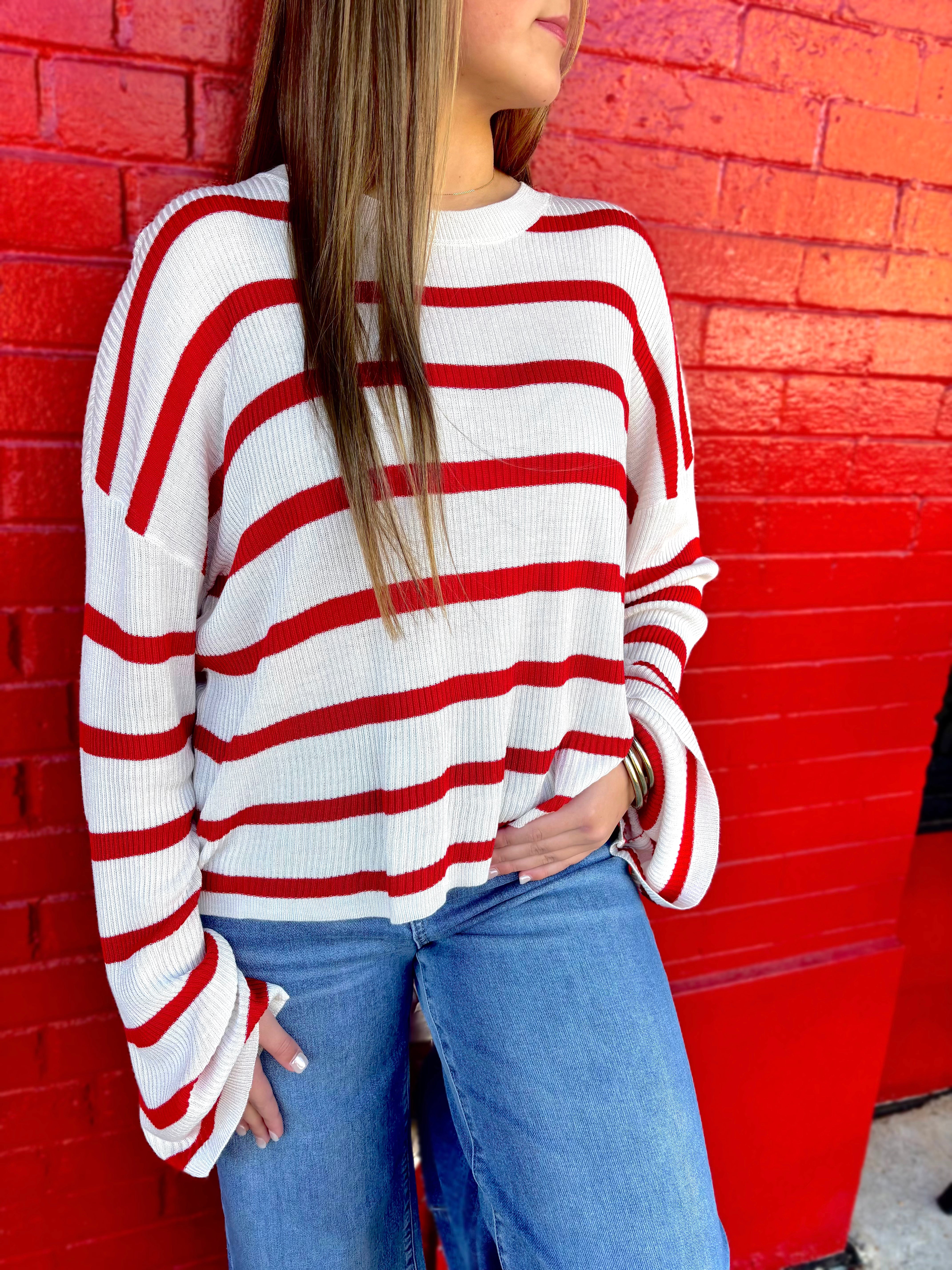 This lightweight essential pullover is created with a soft rayon and acrylic blend, featuring a vertical ribbed texture and bold horizontal stripes. The design includes a gentle crew neckline and roomy drop-shoulder wide sleeves. Cut in a relaxed fit, it pairs perfectly with a denim skirt and ankle boots for a casual weekend outfit. 50% Rayon 50% Acrylic